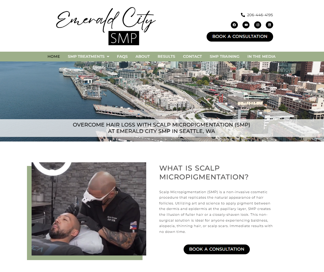 Emerald City Ink is a scalp micropigmentation studio located in Seattle, WA. This website includes a before and after image sliders, a filterable results gallery, and information about treatment options.