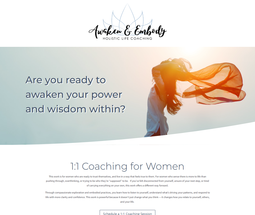 Awaken & Embody is a website for holistic life coaching for women. This is a one page design allows for easy navigation with direct links to a scheduling calendar.